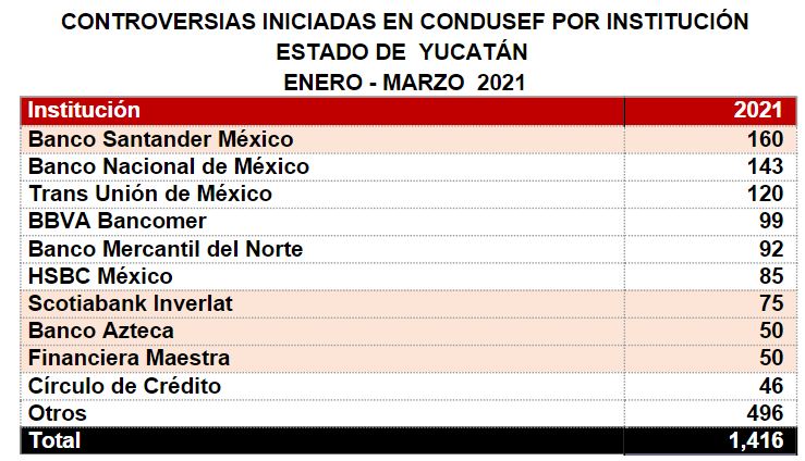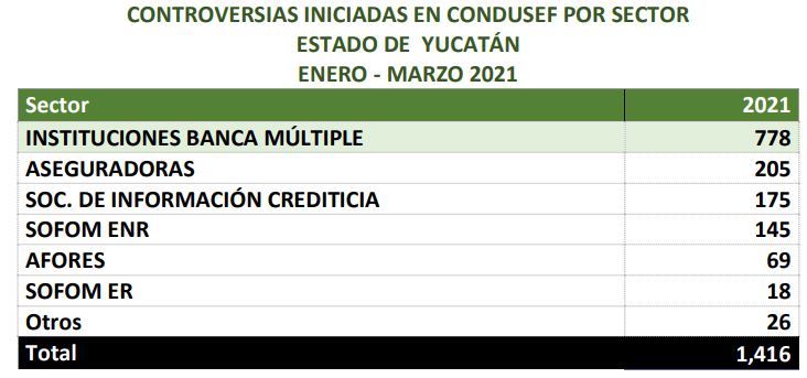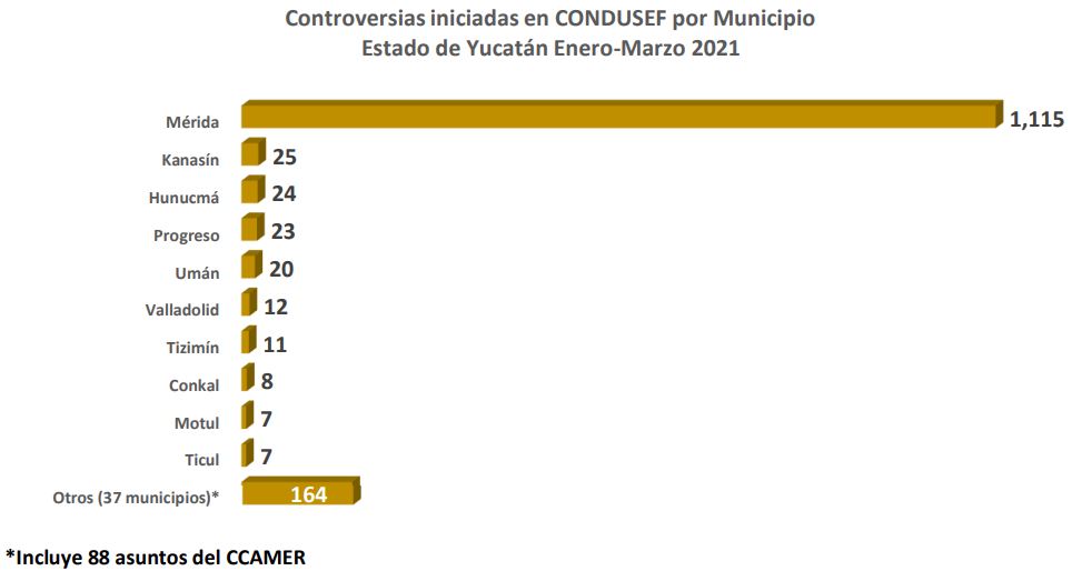 Durante enero - marzo de 2021, la CONDUSEF registró 1,416 controversias en la entidad, el municipio de Mérida recibió el 78.7% de éstas.