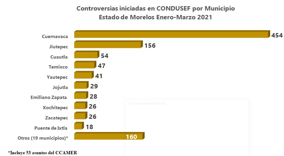 Durante enero - marzo de 2021, la CONDUSEF registró 1,039 controversias en la entidad. El municipio de Cuernavaca fue el que presentó el mayor número de controversias durante enero – marzo de 2021, participando con el 43.7% del total.