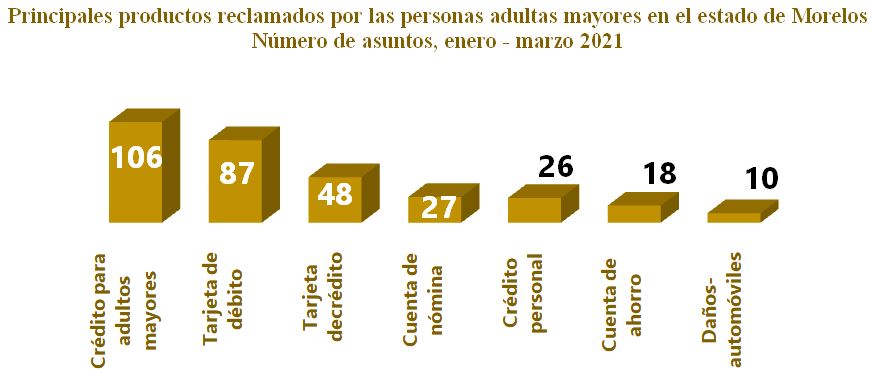Los productos más reclamados en el estado de Morelos fueron:Tarjeta de débito, Tarjeta de crédito, Crédito para adultos mayores y Daños-Automóviles que en conjunto representaron el 58% del total.