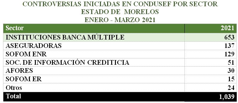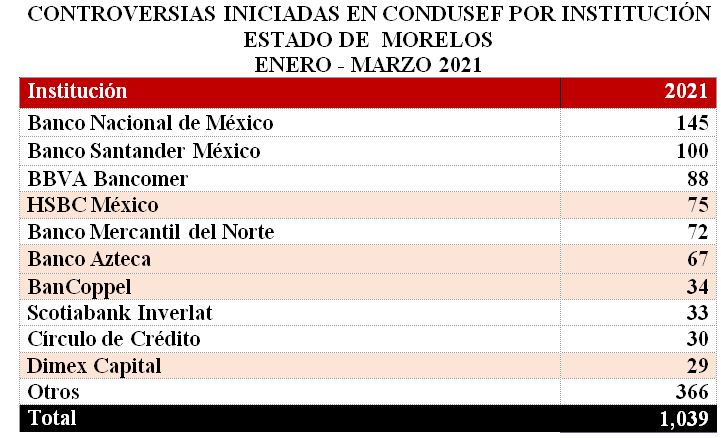 La Comisión Nacional para la Protección y Defensa de los Usuarios de Servicios Financieros (CONDUSEF) informa sobre las controversias presentadasen el estado de Morelos al cierre de 2020 y durante enero - marzode 2021.