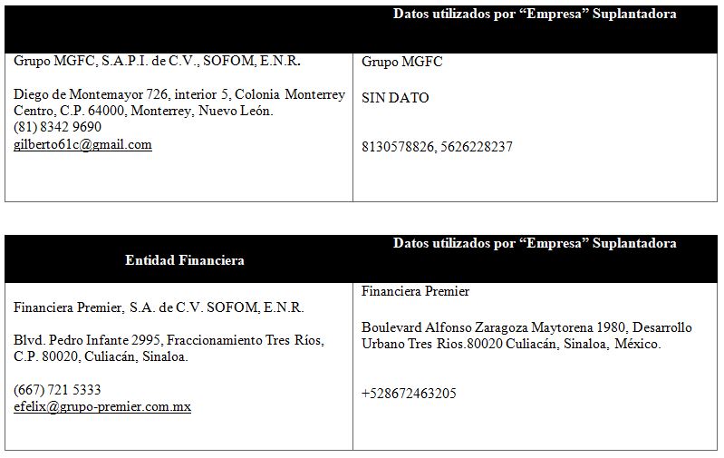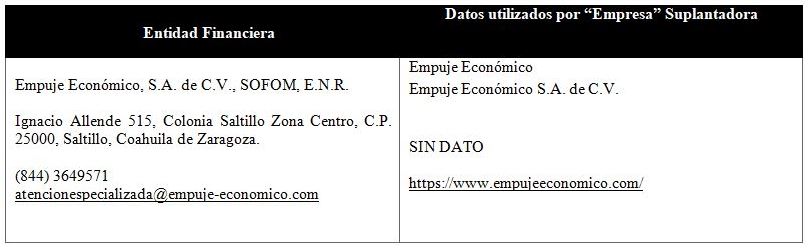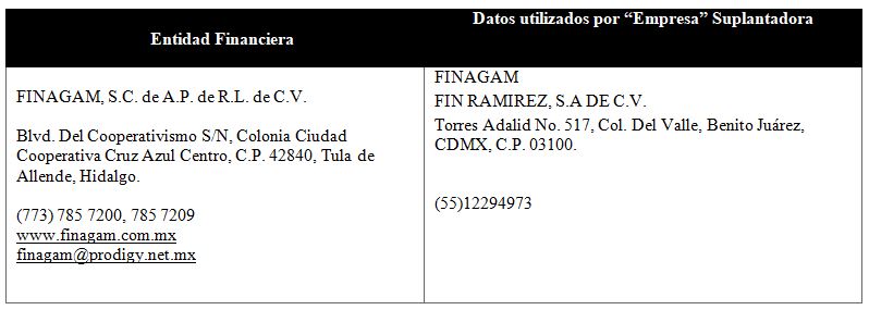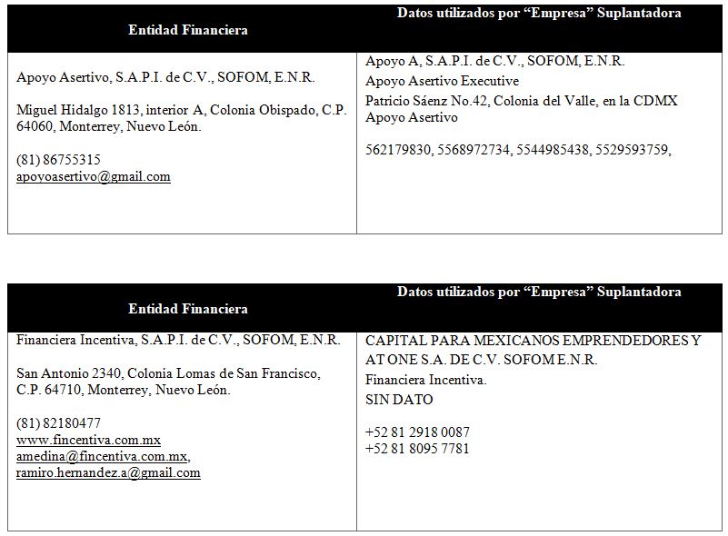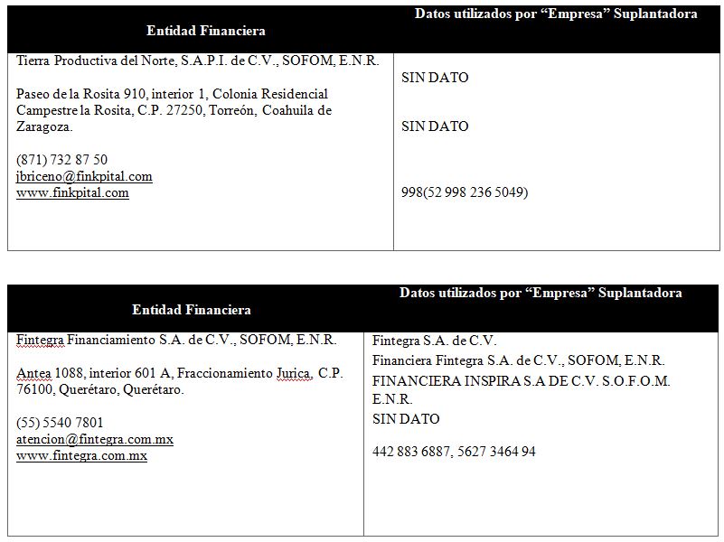 La Comisión Nacional para la Protección y Defensa de los Usuarios de Servicios Financieros (CONDUSEF) informa a la población los nombres de las instituciones financieras afectadas por la suplantación de su nombre comercial e incluso de algunos de sus datos fiscales o administrativos, conforme a lo siguiente: