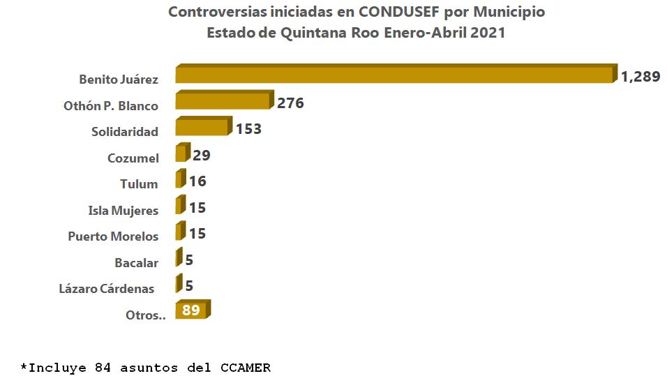 Durante el periodo enero - abril de 2021, la CONDUSEF registró 1,892 controversias en la entidad, el municipio de Benito Juárez fue el que mayor número de controversias recibió durante estos primeros cuatro meses, concentrando el 68.1% del total de éstas.