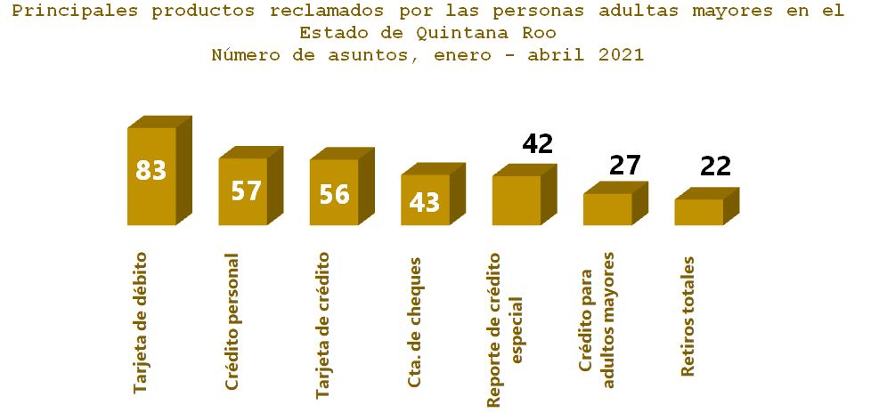 Los productos más reclamados en el estado de Quintana Roo fueron: Reporte de crédito especial, Tarjeta de crédito, Tarjeta de débito y Cuenta de cheques, que en conjunto representaron el 59% del total.