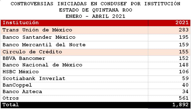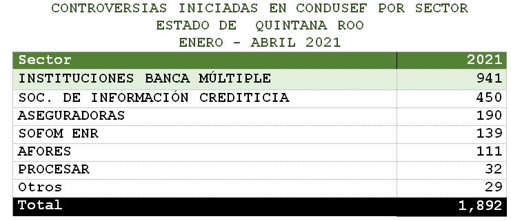 La Comisión Nacional para la Protección y Defensa de los Usuarios de Servicios Financieros (CONDUSEF) informa sobre las controversias presentadas en el estado de Quintana Roo al cierre de 2020 y durante enero - abril de 2021.