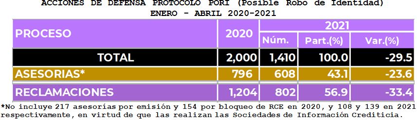 Al mes de abril las acciones de defensa para atender un posible robo de identidad ascendieron a 1,410, de las cuales 608 fueron asesorías y 802 se concretaron como reclamaciones (el 57% del total). En los primeros cuatro meses de 2021, las reclamaciones por un posible robo de identidad mostraron una reducción de 33.4%,respecto de igual periodo del año anterior.