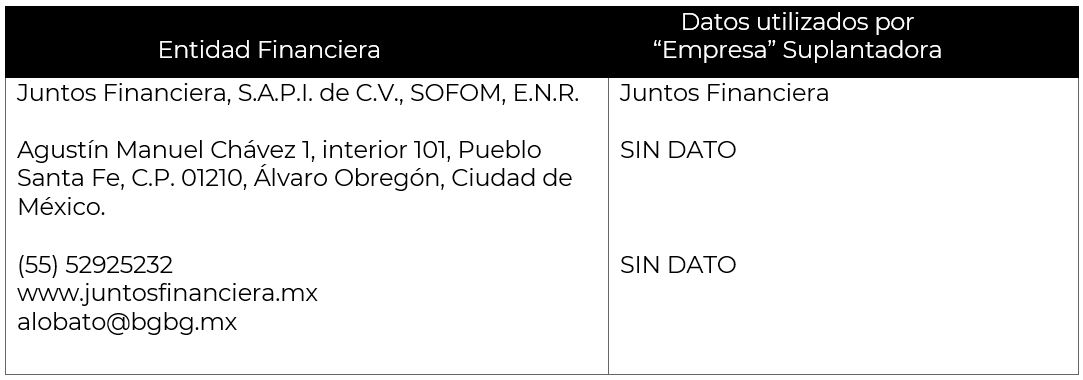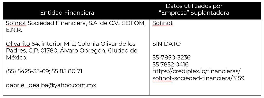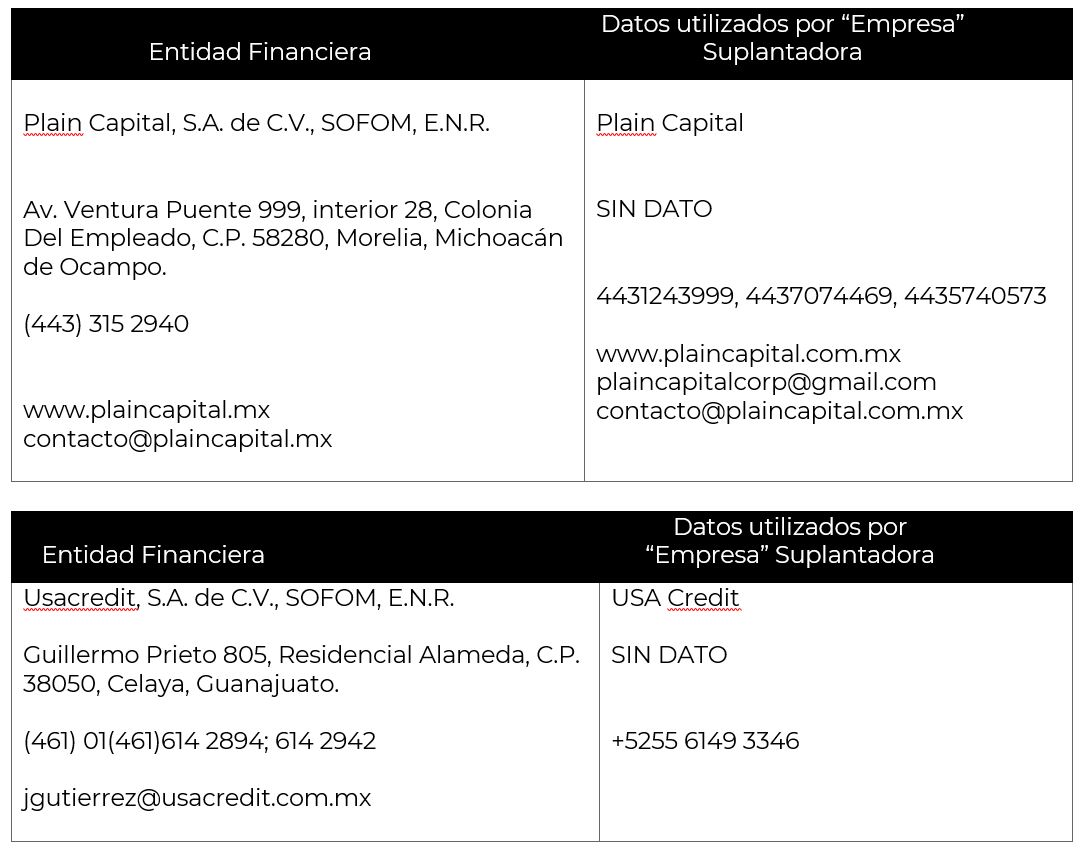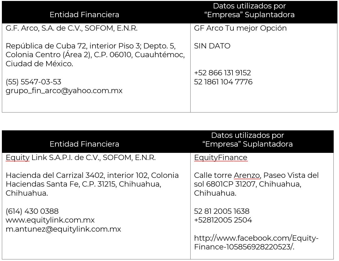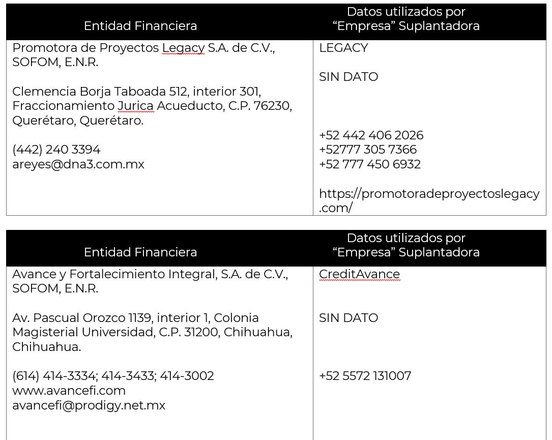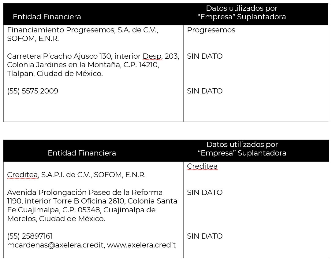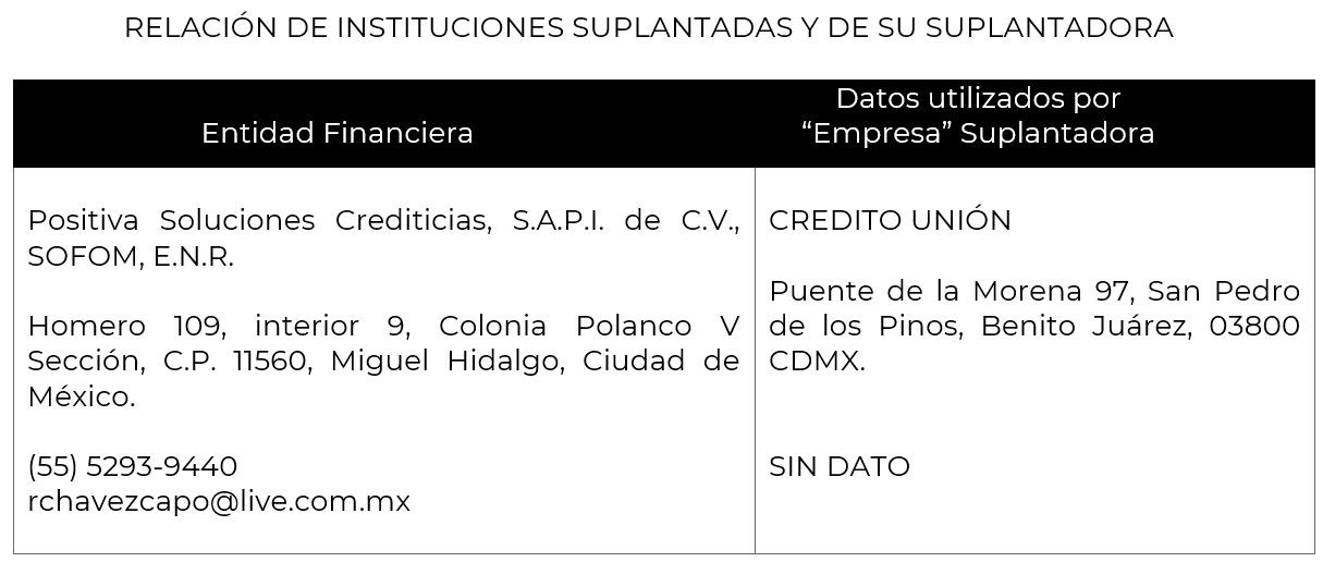La Comisión Nacional para la Protección y Defensa de los Usuarios de Servicios Financieros (CONDUSEF) informa a la población los nombres de las instituciones financieras afectadas por la suplantación de su nombre comercial e incluso de algunos de sus datos fiscales o administrativos, conforme a lo siguiente: