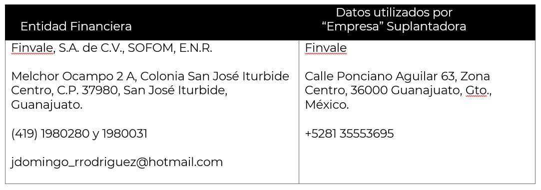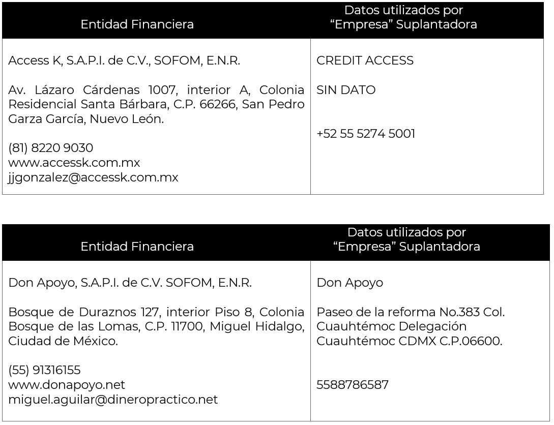 2. Utilizan información como razón social, direcciones, teléfonos e imagen corporativa (logotipos) de las entidades financieras debidamente autorizadas y registradas, para hacerse pasar por ellas.