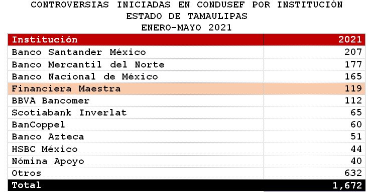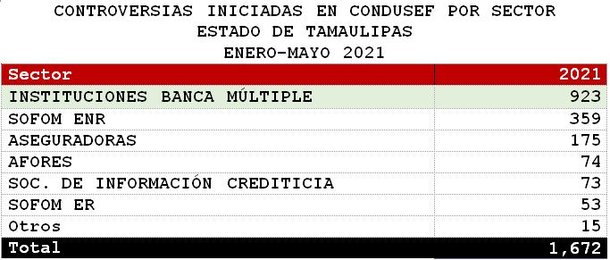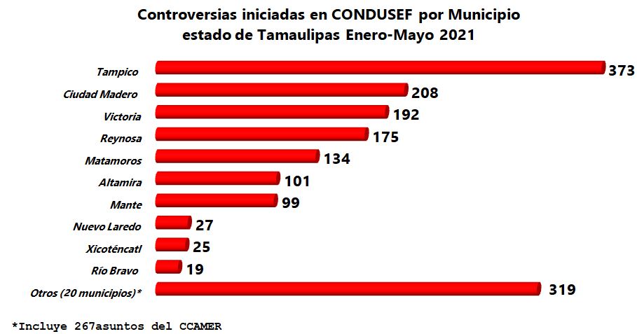 Durante el periodo enero - mayo de 2021, la CONDUSEF registró 1,672 controversias en la entidad, dos municipios, el de Tampico y Ciudad Madero, concentraron 35% del total de éstas.