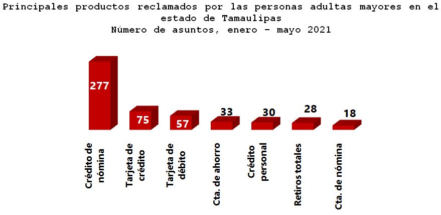 Los productos más reclamados en el estado de Tamaulipasson:Crédito de nómina, Tarjeta de crédito,Tarjeta de débito y Crédito personal, que en conjunto representaron el 56% del total.