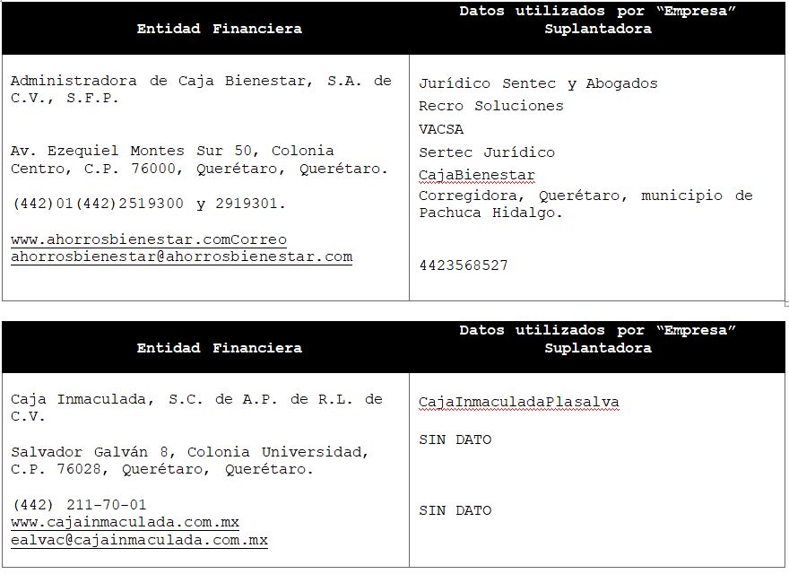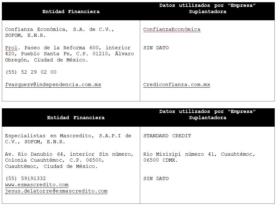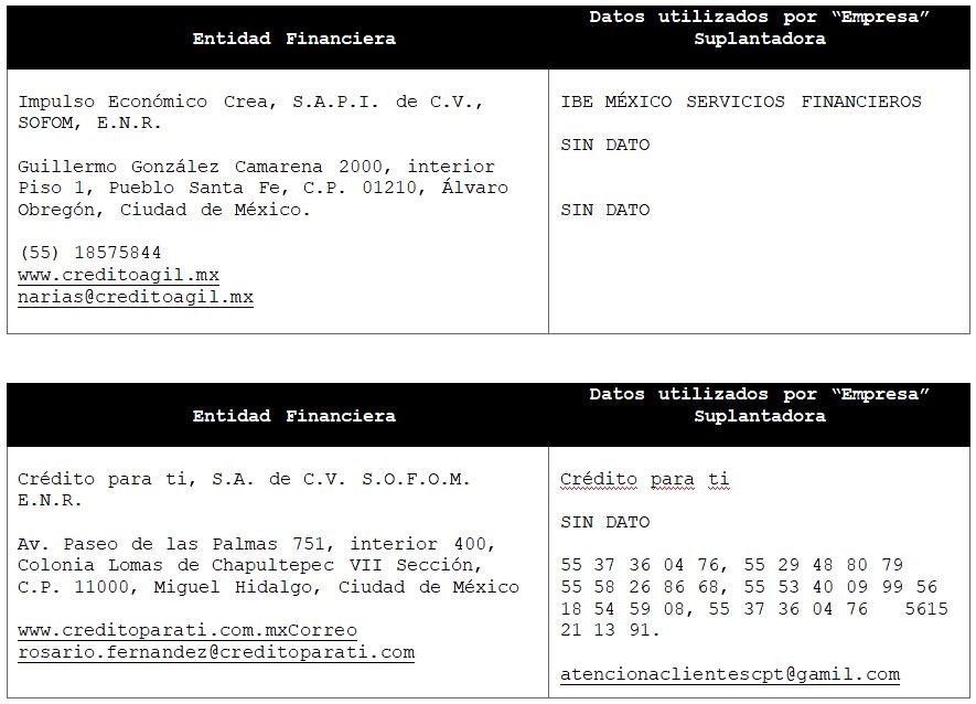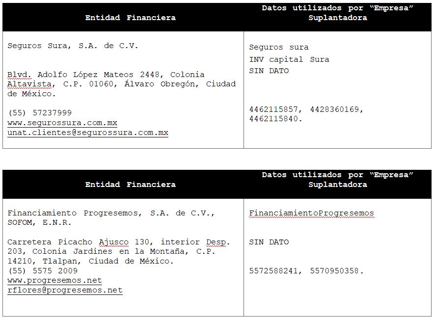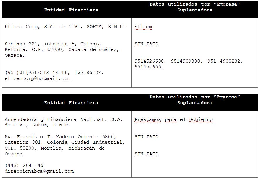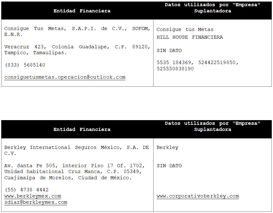 La Comisión Nacional para la Protección y Defensa de los Usuarios de Servicios Financieros (CONDUSEF) informa a la población los nombres de las instituciones financieras afectadas por la suplantación de su denominación comercial e incluso de algunos de sus datos fiscales o administrativos, con los cuales personas sin escrúpulos tratan de engañar a interesados en contratar algún crédito o seguro, conforme a lo siguiente: