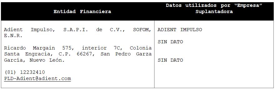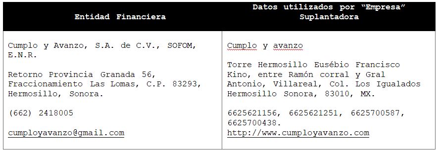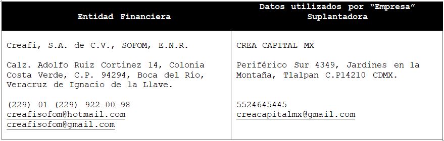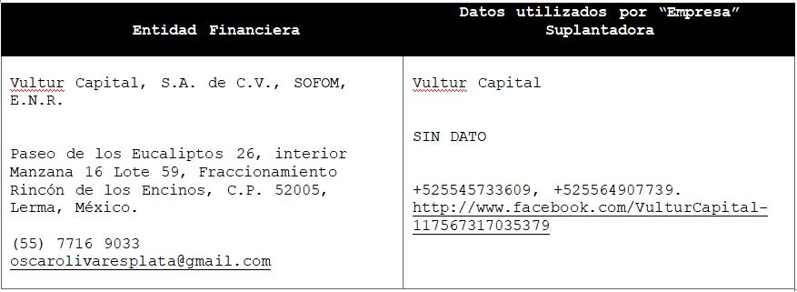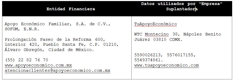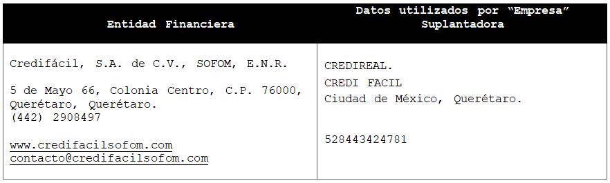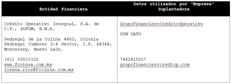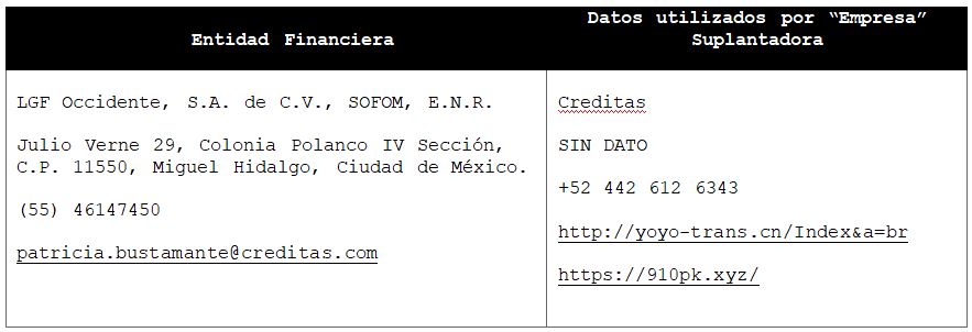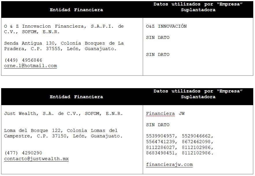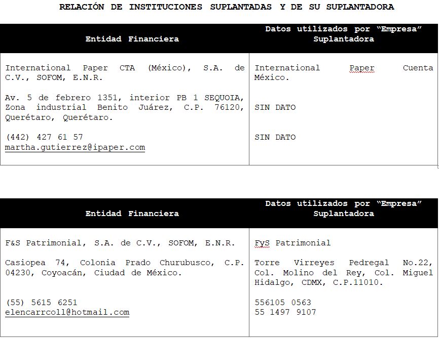 La Comisión Nacional para la Protección y Defensa de los Usuarios de Servicios Financieros (CONDUSEF) informa a la población los nombres de las instituciones financieras afectadas por la suplantación de su denominación comercial e incluso de algunos de sus datos fiscales o administrativos, con los cuales personas sin escrúpulos tratan de engañar a interesados en contratar algún crédito o seguro, conforme a lo siguiente: