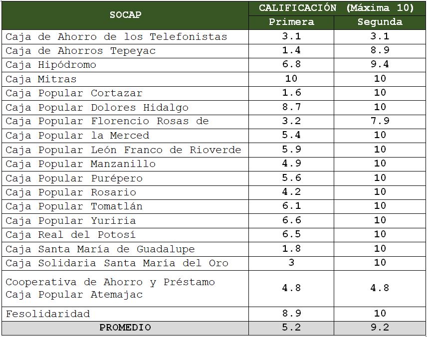 Las Instituciones con las calificaciones más bajas son Cooperativa de Ahorro y Préstamo Caja Popular Atemajac con 4.8, Caja de Ahorro de los Telefonistas con 3.1 y J.P. Sofiexpress con 2.9, quienes conservaron la misma calificación de la primera revisión, toda vez que no remitieron la evidencia del cumplimiento a lo ordenado en tiempo y forma.