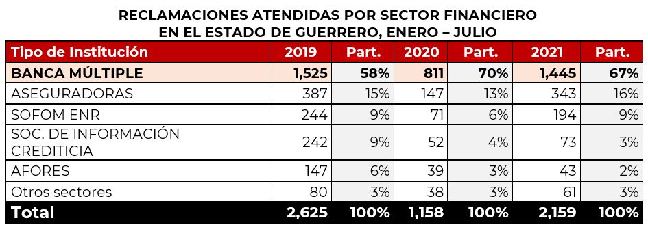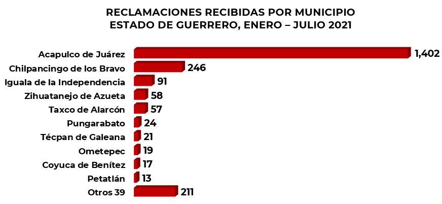 Respecto a la distribución de las reclamaciones atendidas en la entidad, durante enero-julio de 2021 se recibieron asuntos de 49 municipios, de los cuales 3 de ellos concentraron el 80.6% de las reclamaciones: Acapulco de Juárez con el 65%, Chilpancingo de los Bravo 11.4% e Iguala de la Independencia con 4.2%.