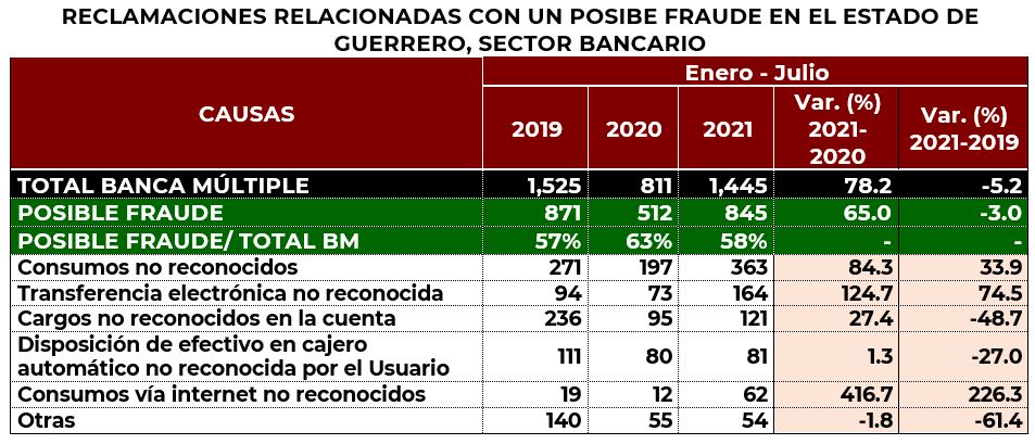 Las principales causas de reclamación fueron las relacionadas con los consumos no reconocidos, los despachos de cobranza y la negativa en el pago de la indemnización, que en conjunto representaron el 35% del total de las reclamaciones presentadas en dicha entidad. Es importante mencionar que la CONDUSEF ha identificado causas de reclamo que están relacionadas con un posible fraude, principalmente en el sector bancario; y en el estado de Guerrero, del total de reclamaciones presentadas en contra de los bancos, el 58% está relacionado con un posible fraude, fundamentalmente originadas por llamadas telefónicas, acceso a páginas apócrifas y en cajeros automáticos. Al respecto, destaca que el incremento de estos asuntos se registró en los consumos no reconocidos y en las transferencias electrónicas no reconocidas, por ello es muy importante que los usuarios no contesten a llamadas realizadas supuestamente de su banco, no accedan a páginas que les llegan a través de redes sociales o den sus claves o datos personales, si no iniciaron ellos mismos algún tipo de consulta.