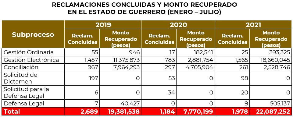 Reclamaciones concluidas y montos recuperados En cuanto a los montos recuperados en las reclamaciones concluidas en el periodo, su importe sumó 22 millones de pesos, lo que significó un 184.3% más que en el mismo periodo de 2020 y un 14% más respecto a 2019.
