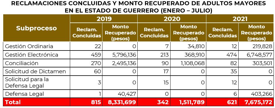De los asuntos concluidos en 2021, el 31.4% fueron de adultos mayores y respecto al monto recuperado total, el 35% correspondió para este mismo estrato de edad.