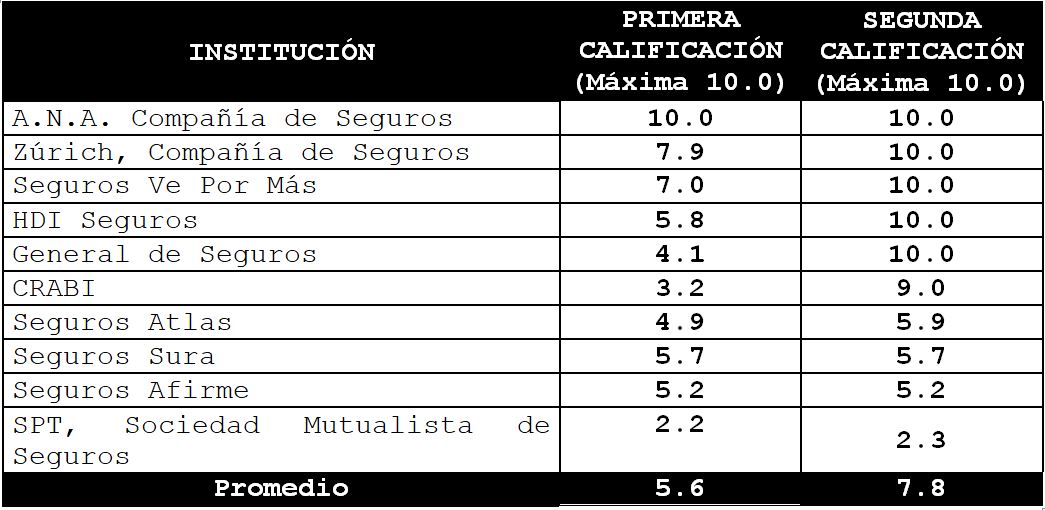 Como se muestra en el cuadro, una institución de seguros cumplió con la norma vigente por lo que obtuvo 10 desde la primera revisión y 5 instituciones mejoraron su calificación en la segunda revisión.