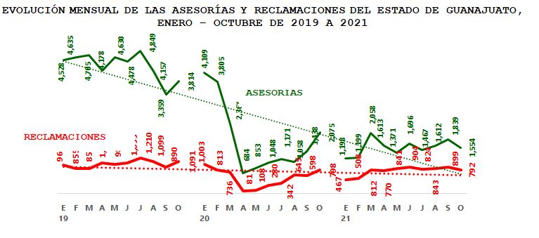 La Comisión Nacional para la Protección y Defensa de los Usuarios de Servicios Financieros (CONDUSEF) informa sobre la evolución de las controversias iniciadas en el estado de Guanajuatoen el periodo enero-octubre de 2021, en comparación con el mismo periodo del año anterior y de 2019, que fueron atendidas por los funcionarios con los que cuentala Unidad de Atención a Usuarios (UAU) ubicada enla Col. Obregón, León, Gto.