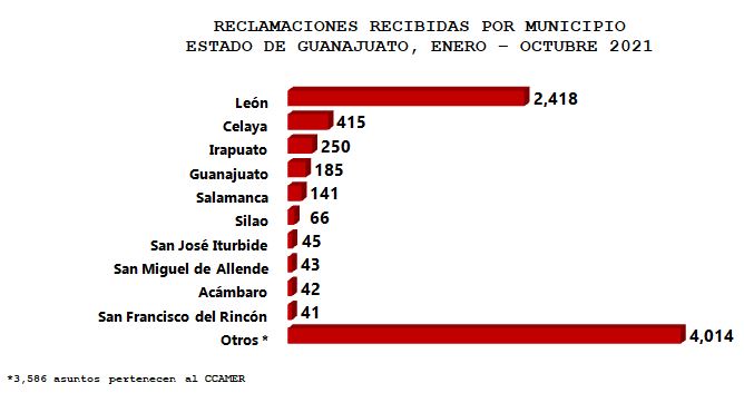 Respecto a la distribución geográfica de las reclamacionesatendidas en el estado de Guanajuato, en el periodo analizadose recibieron asuntos de 44municipios, de los cuales 2de ellos concentraron el 37% de las reclamaciones: León y Celaya.