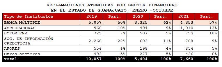 Del total de las reclamaciones atendidas en 2021 por la CONDUSEF en este estado, el 57% correspondieron ala Banca Múltiple, el 13% a las Aseguradoras y el 30% restante a otros sectores.En cuanto a la variación, el sector de las Aseguradoras fue el que mostró el mayor crecimiento porcentual, 104% (al pasar de 494 asuntos en 2020 a 1,010asuntos en 2021), motivado principalmente por las mayores reclamaciones por la Negativa en el pago de la Indemnización.