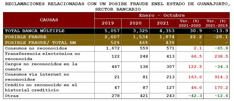 Por otra parte, la CONDUSEF ha identificado aquellas causas de reclamación que están relacionadas con un posible fraude, principalmente en el sector bancario; y en el estado de Guanajuato, del total de las reclamaciones presentadas en contra de los bancos, el 43% estuvieron relacionadascon un posible fraude, fundamentalmente originadas por llamadas telefónicas, acceso a páginas apócrifas y en cajeros automáticos.