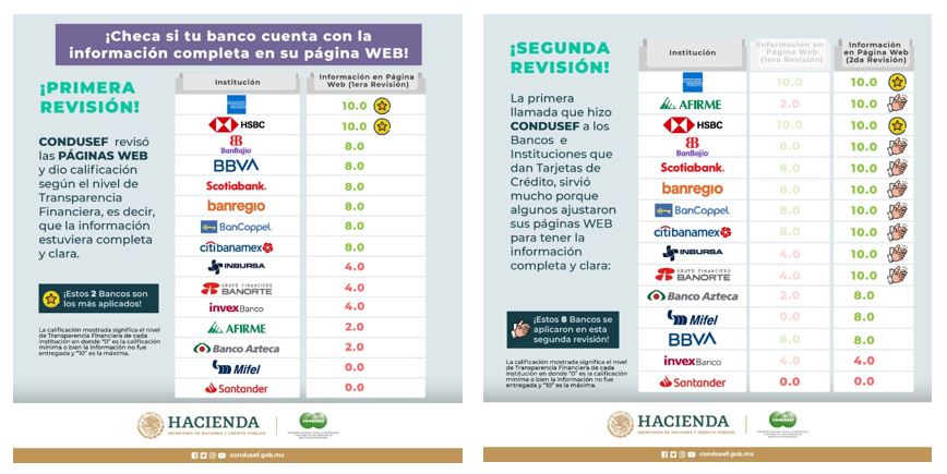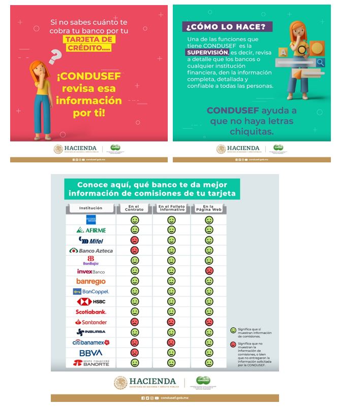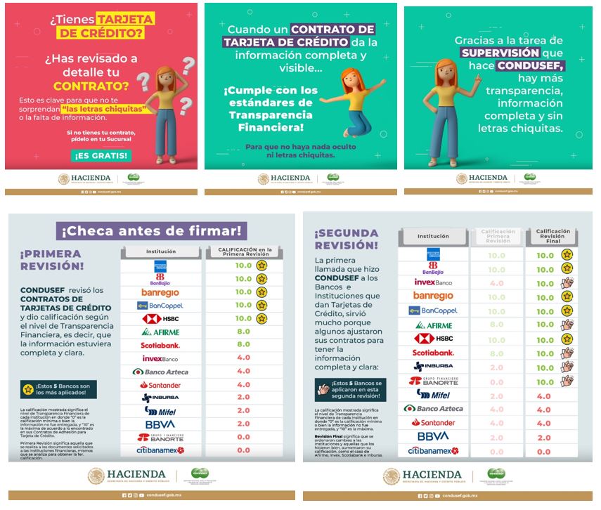 La Comisión Nacional para la Protección y Defensa de los Usuarios de Servicios Financieros (CONDUSEF) ha informado en los últimos días a través de sus redes sociales: Facebook, Instagram y Twitter, sobre los resultados de la revisión de los documentos e información del producto Tarjeta de Crédito, ofrecido por las principales Instituciones Financieras emisoras del mismo, conforme a las facultades de supervisión en materia de transparencia financiera y protección al usuario, que le otorgan diversos ordenamientos legales.