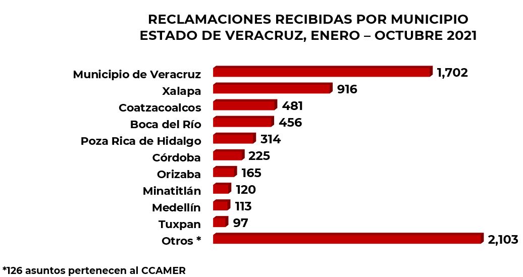 Respecto a la distribución geográfica de las reclamaciones atendidas en el estado de Veracruz, en el periodo analizado se recibieron asuntos de 166 municipios, de los cuales 2 de ellos concentraron el 39% de las reclamaciones: Veracruz y Xalapa.