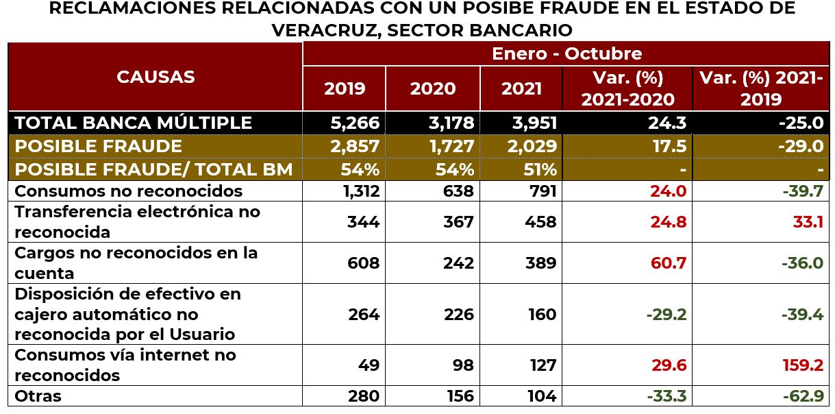 Por otra parte, la CONDUSEF ha identificado aquellas causas de reclamación que están relacionadas con un posible fraude, principalmente en el sector bancario; y en el estado de Veracruz, del total de las reclamaciones presentadas en contra de los bancos, el 51% estuvieron relacionadas con un posible fraude, fundamentalmente originadas por llamadas telefónicas, acceso a páginas apócrifas y en cajeros automáticos.
