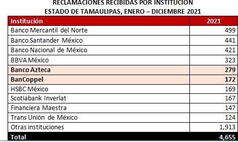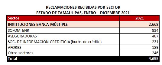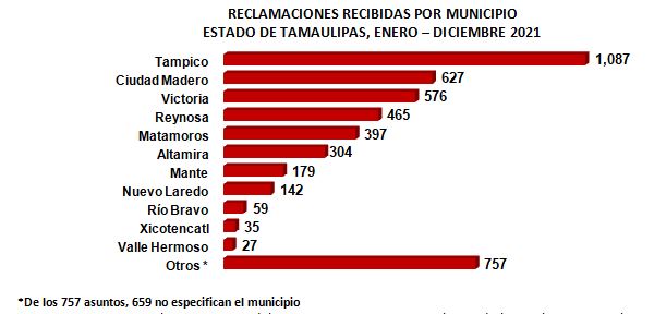 Para 2021la CONDUSEF registró 4,655 reclamaciones en el estado de Tamaulipas,lo que representó un incremento del 37% respecto al año 2020; estas reclamaciones recibidas en la entidad se originaron por usuarios que habitan en 38 municipios, de los cuales uno de ellos, el de Tampico, concentró el 23.4% del total de dichas reclamaciones, seguido por Ciudad Madero con un 13.5% y Victoria con 12.4%.