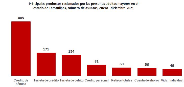 Por su parte, en 2021 las personas adultas mayores presentaron el 35% de las reclamaciones; los productos que más reclamaron fueron Crédito de nómina, Tarjeta de crédito y Tarjeta de débito.