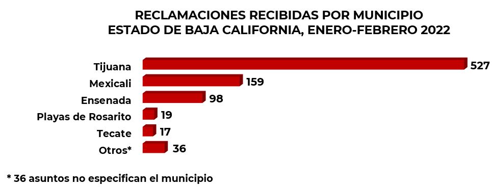 Las reclamaciones recibidas por la CONDUSEF en 2022 en esta entidad, se interpusieron por usuarios que habitan en 5 municipios, siendo el de Tijuana el que concentró 61.6% del total, seguido por Mexicali con el 18.6%.