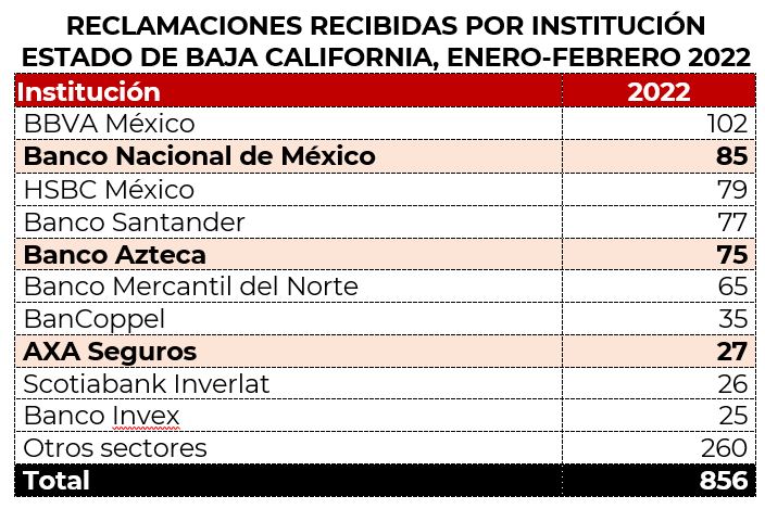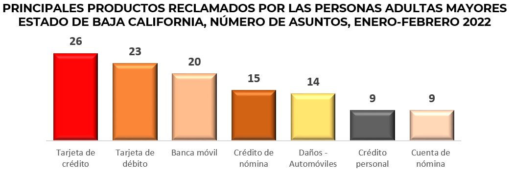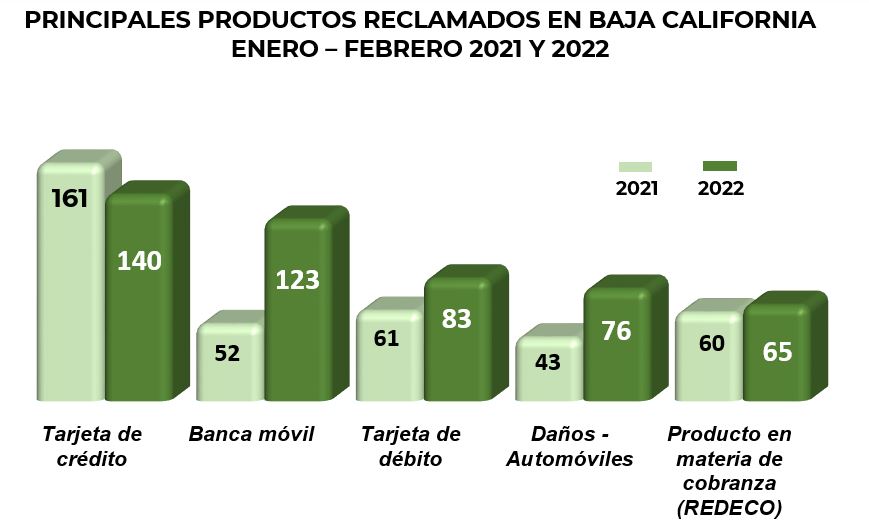 Los productos más reclamados en enero y febrero de 2022, en el estado de Baja California, fueron: tarjeta de crédito, banca móvil y la tarjeta de débito, que en conjunto representaron el 40% del total de las reclamaciones en esta entidad.