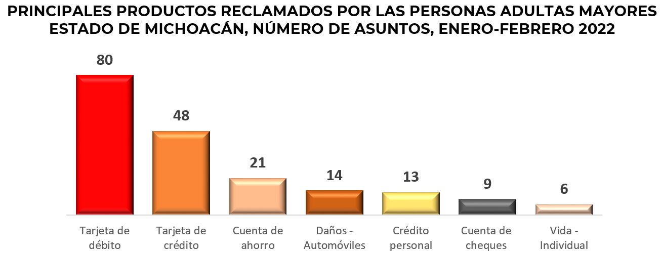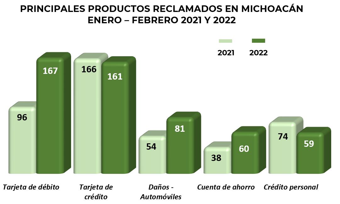 Los productos más reclamados en el estado de Michoacán fueron: la tarjeta de débito, la tarjeta de crédito y el seguro de automóviles, que en conjunto representaron el 51% del total de las reclamaciones en esta entidad.