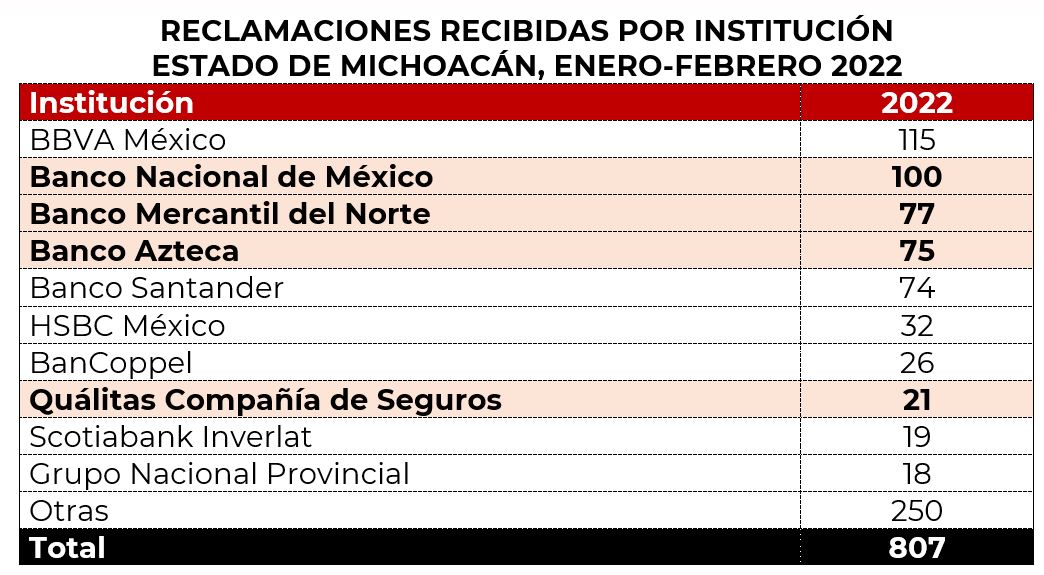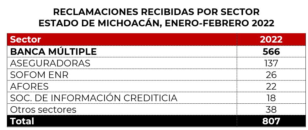 En los primeros dos meses de 2022, la Unidad de Atención a Usuarios (UAU) de CONDUSEF registró 807 reclamaciones en el estado de Michoacán, lo que representó un aumento del 2% respecto al mismo periodo de 2021 cuando se registraron 791 reclamaciones.