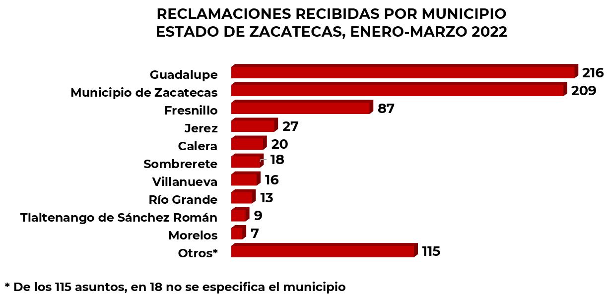 Las reclamaciones recibidas por la CONDUSEF en 2022, en esta entidad, se interpusieron por usuarios que habitan en 43 municipios, siendo el municipio de Guadalupe el que concentró el 29.3% del total, seguido por el municipio de Zacatecas con el 28.4%.