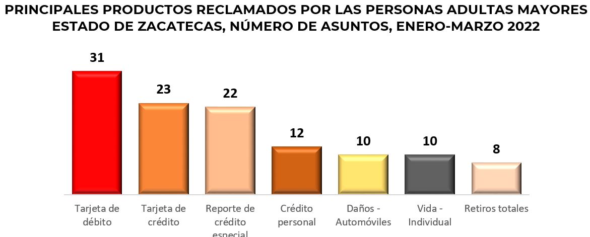 Por su parte, el segmento de personas adultas mayores presentó el 28.4% de las reclamaciones totales en el periodo enero - marzo de 2022 y los productos que más reclamó este segmento de la población fueron: tarjeta de débito, tarjeta de crédito y el reporte de crédito especial.