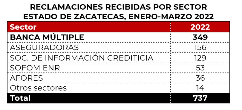 En los primeros tres meses de 2022la Unidad de Atención a Usuarios (UAU) de la CONDUSEF registró 737 reclamaciones en el estado de Zacatecas,lo que representó una disminución de 18.8% respecto al mismo periodo de 2021 cuando se registraron 908.