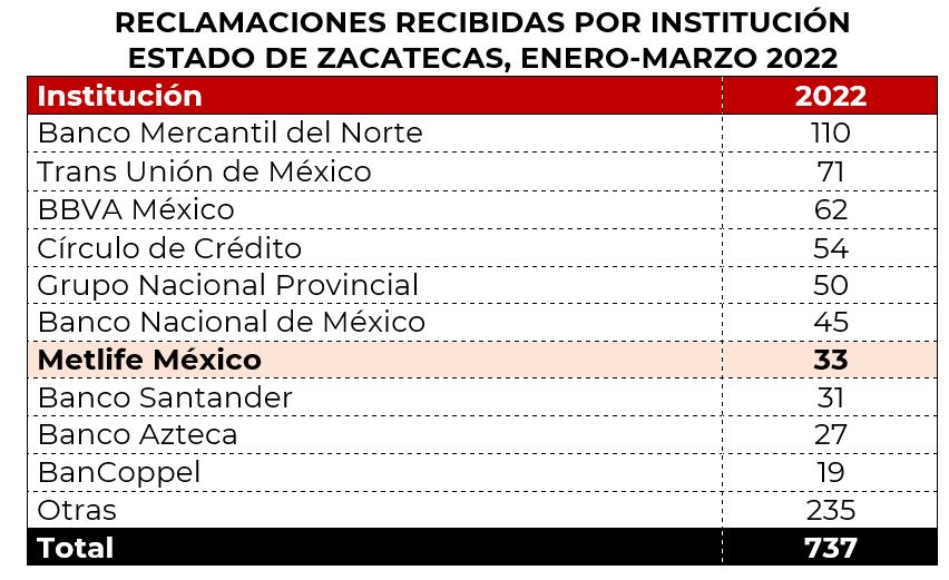 Por otra parte, de las 10 instituciones con mayores reclamaciones en la entidad, sólo una de ellas mostró un incremento respecto a 2021, Metlife México, al pasar de 25 a 33 asuntos.