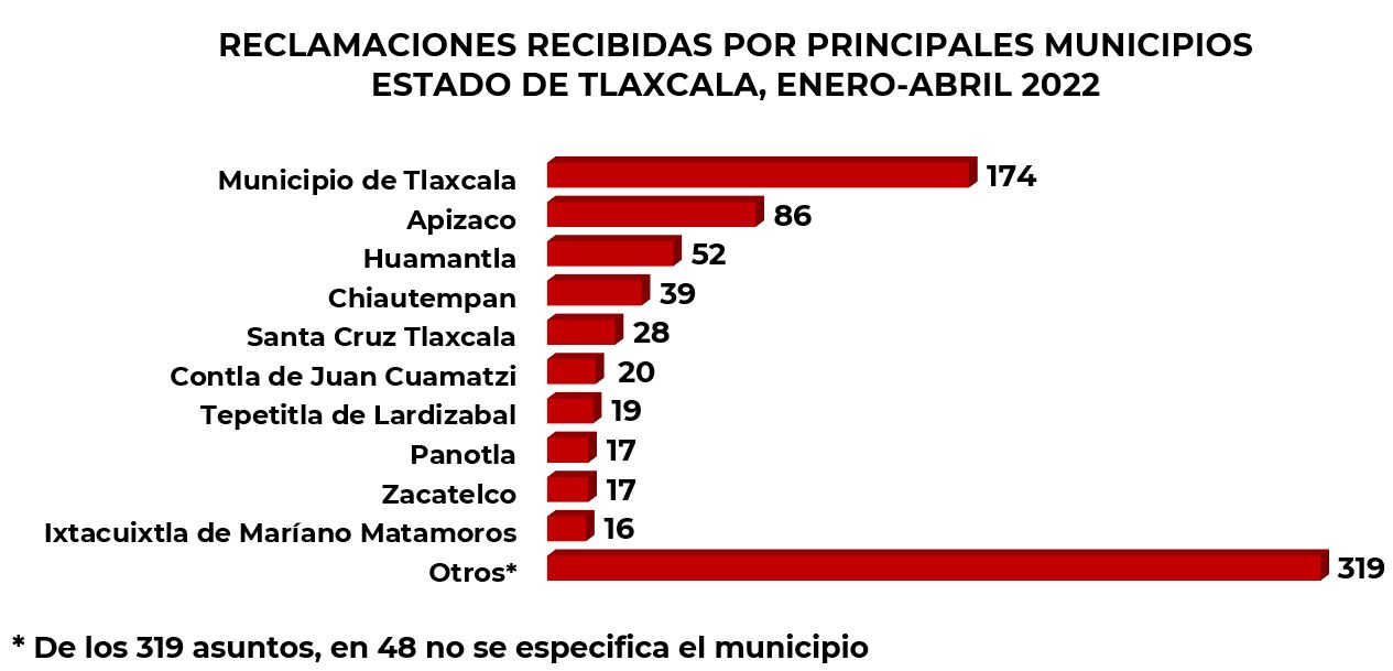 Las reclamaciones recibidas por la CONDUSEF en 2022 en esta entidad, se interpusieron por usuarios que habitan en 57 municipios, siendo el de Tlaxcala el que concentró el 22% del total, seguido por Apizaco con el 11%.