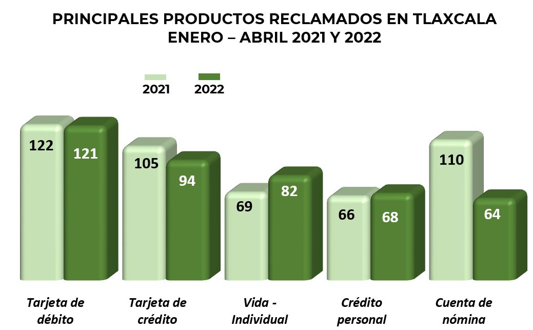 Los productos más reclamados en el estado de Tlaxcala fueron: la tarjeta de débito, la tarjeta de crédito y el seguro vida-individual, que en conjunto representaron el 38% del total de las reclamaciones en esta entidad.