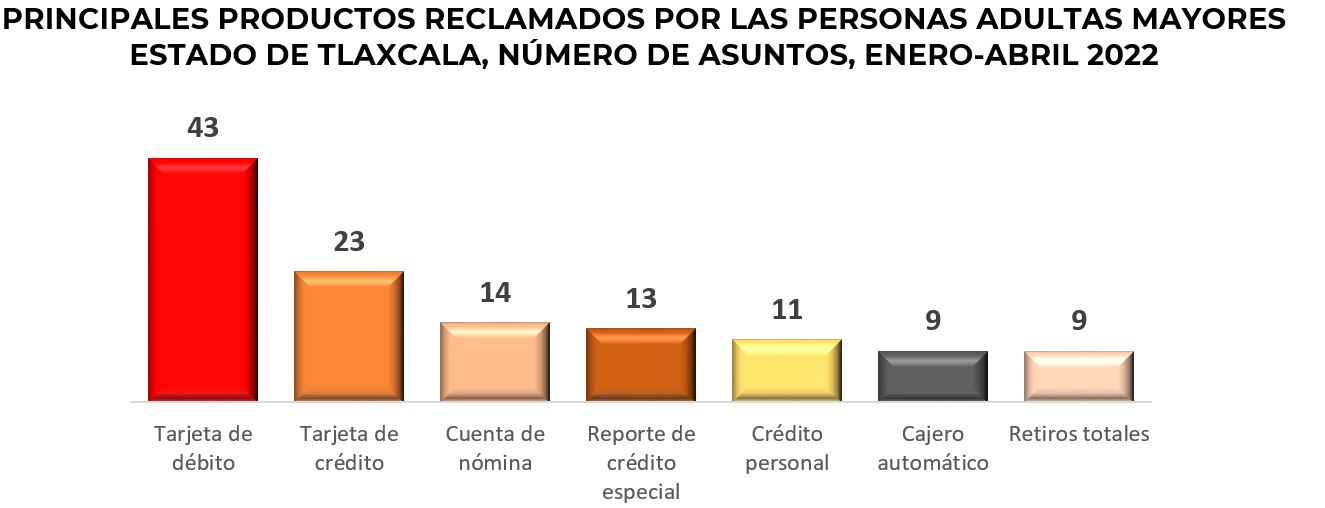 Por su parte, el segmento de personas adultas mayores presentó el 28.4% de las reclamaciones totales en el periodo enero - abril de 2022 y los productos que más reclamó este segmento de la población fueron tarjeta de débito, tarjeta de crédito y la cuenta de nómina.