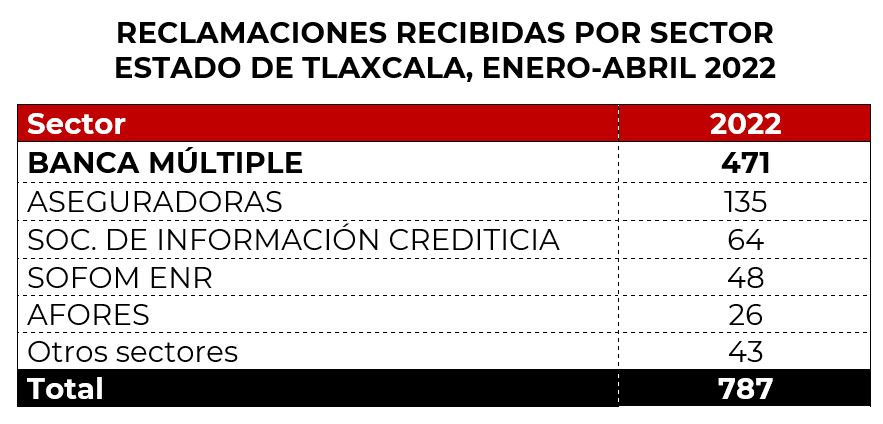 En los primeros cuatro meses de 2022la Unidad de Atención a Usuarios (UAU) de la CONDUSEF, registró 787 reclamaciones en el estado de Tlaxcala,lo que representó una disminución de 13.2% respecto al mismo periodo de 2021 cuando se registraron 907 reclamaciones.