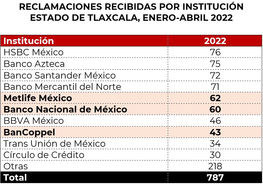 De las 10 instituciones con mayores reclamaciones en la entidad, 3 de ellas mostraron un incremento respecto a 2021, MetLife México al pasar de 32 a 62 asuntos, Banco Nacional de México al pasar de 34 a 60 y BanCoppel al pasar de 25 a 43 asuntos.