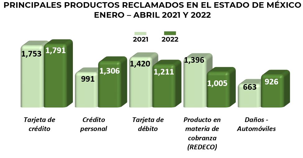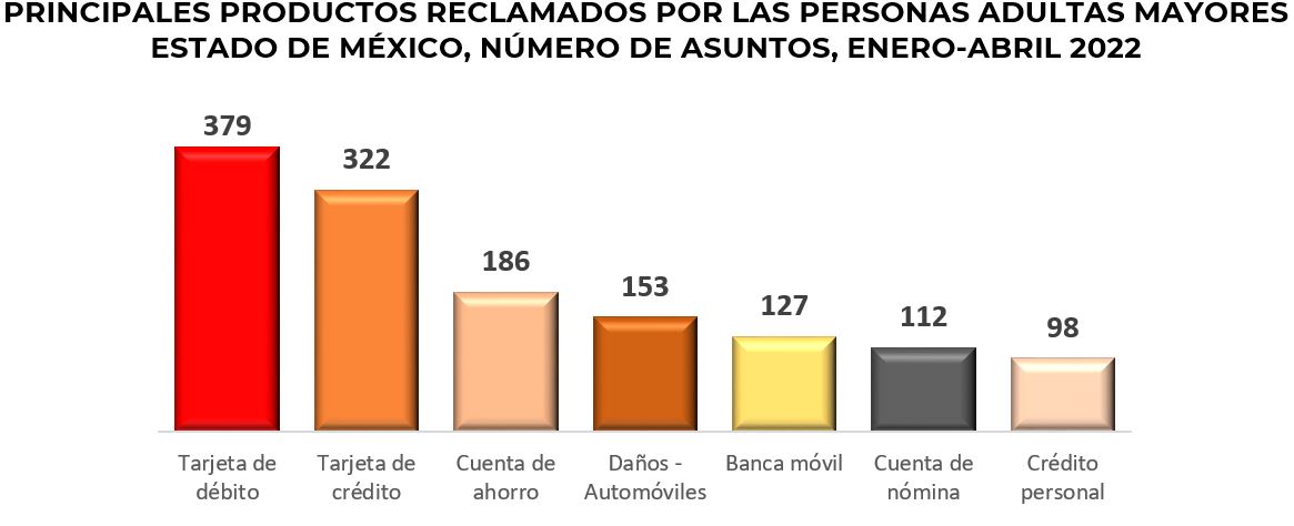 Las causas más representativas por las cuales se presentaron las reclamaciones en el Estado de México fueron: las malas prácticas de agentes en la gestión de cobranza de créditos con 2,688 asuntos, consumos no reconocidos con 1,131 y transferencia electrónica no reconocida con 1,033 asuntos. En conjunto, estas 3 causas concentraron el 45.3% del total. Por su parte, el segmento de personas adultas mayores representó el 26.4% de las reclamaciones totales en el periodo enero - abril de 2022 y los productos que más reclamó este grupo etario fueron la tarjeta de débito, la tarjeta de crédito y la cuenta de ahorro.