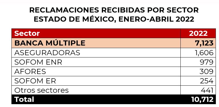 En los primeros cuatro meses de 2022 la Unidad de Atención a Usuarios (UAU) de la CONDUSEF, registró 10,712 reclamaciones en el Estado de México,lo que representó un incremento de 6.4% respecto al mismo periodo de 2021, cuando se registraron 10,065 reclamaciones.