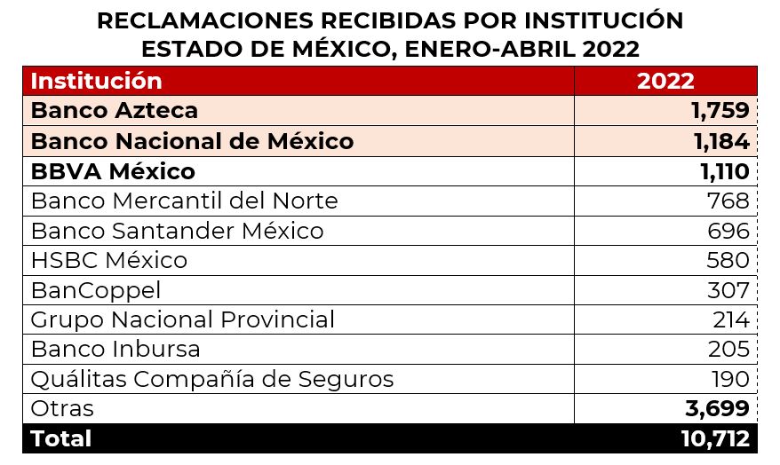 Las instituciones que registraron el mayor número de reclamaciones fueron: Banco Azteca, Banco Nacional de México, BBVA México y Banco Mercantil del Norte, que en conjunto concentraron el 45% del total. De las 10 instituciones con mayores reclamaciones en la entidad, 2 de ellas mostraron un incremento importante respecto a 2021: Banco Azteca al pasar de 983 a 1,759 asuntos (79.8%), y Banco Nacional de México al pasar de 986 a 1,184 asuntos (20.1%).