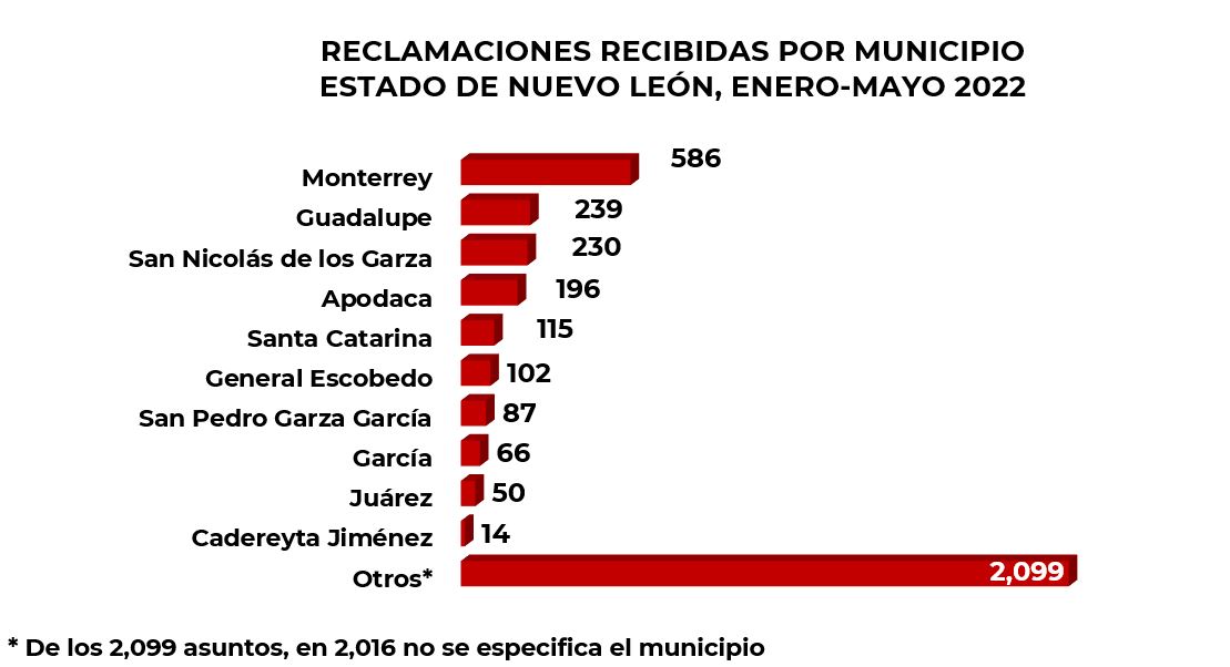 Las reclamaciones recibidas por CONDUSEF en 2022 en esta entidad, se interpusieron por usuarios que habitan en 29 municipios, siendo el municipio de Monterrey el que concentró el 15.5% del total, seguido por Guadalupe con el 6.3%.