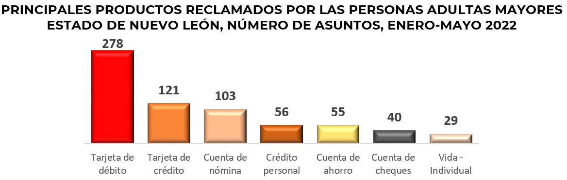 Por su parte, el segmento de personas adultas mayores representó el 31.5% de las reclamaciones totales en el periodo enero - mayo de 2022 y los productos que más reclamó este grupo de la población fueron la Tarjeta de débito, la Tarjeta de crédito y Cuenta de nómina.