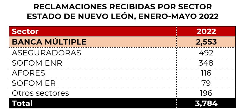 Por sector, destaca la Banca Múltiple con el 67% del total de los asuntos recibidos (2,553 reclamaciones), seguida por las Aseguradoras con el 13% (492 asuntos).