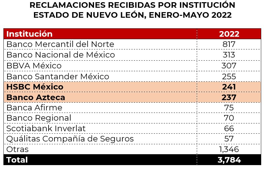 Las instituciones que registraron el mayor número de reclamaciones fueron; Banco Mercantil del Norte, Banco Nacional de México, BBVA México y Banco Santander de México, que en conjunto concentraron el 45% del total. De las 10 instituciones con mayores reclamaciones en la entidad, 2 de ellas mostraron un incremento importante con respecto a 2021, HSBC México al pasar de 176 a 241 y Banco Azteca al pasar de 181 a 237 asuntos.